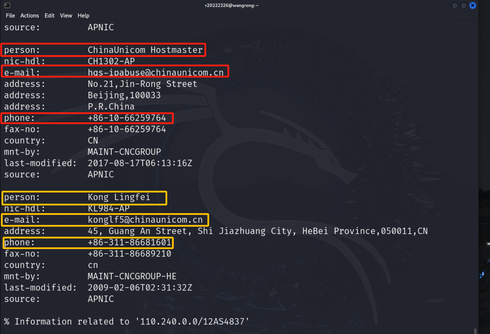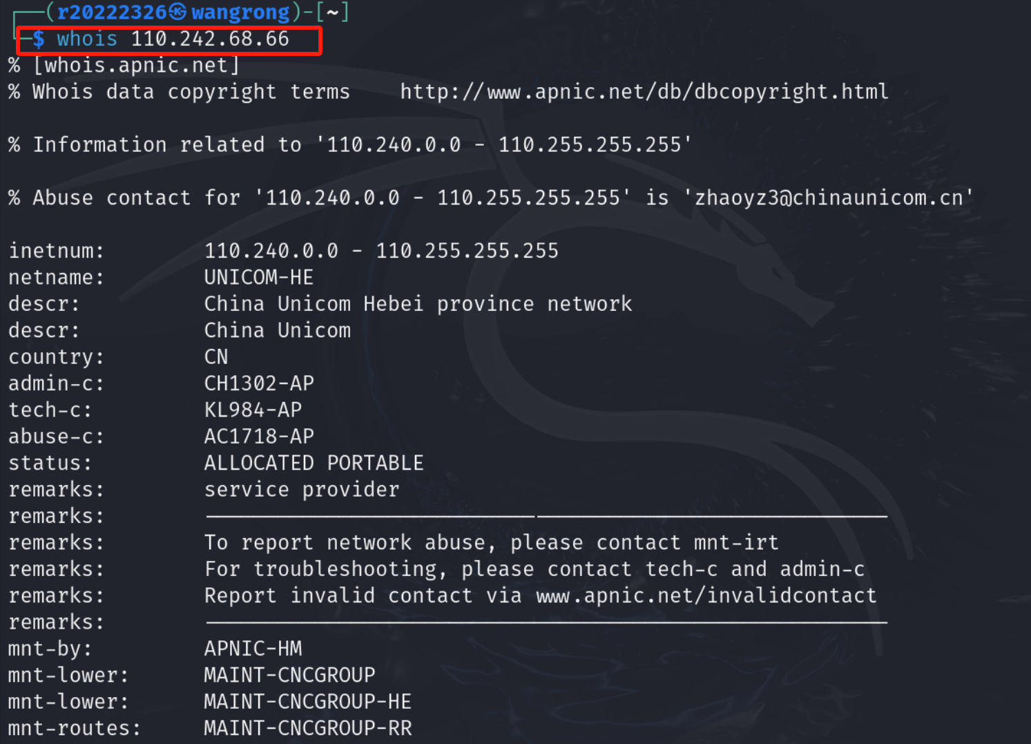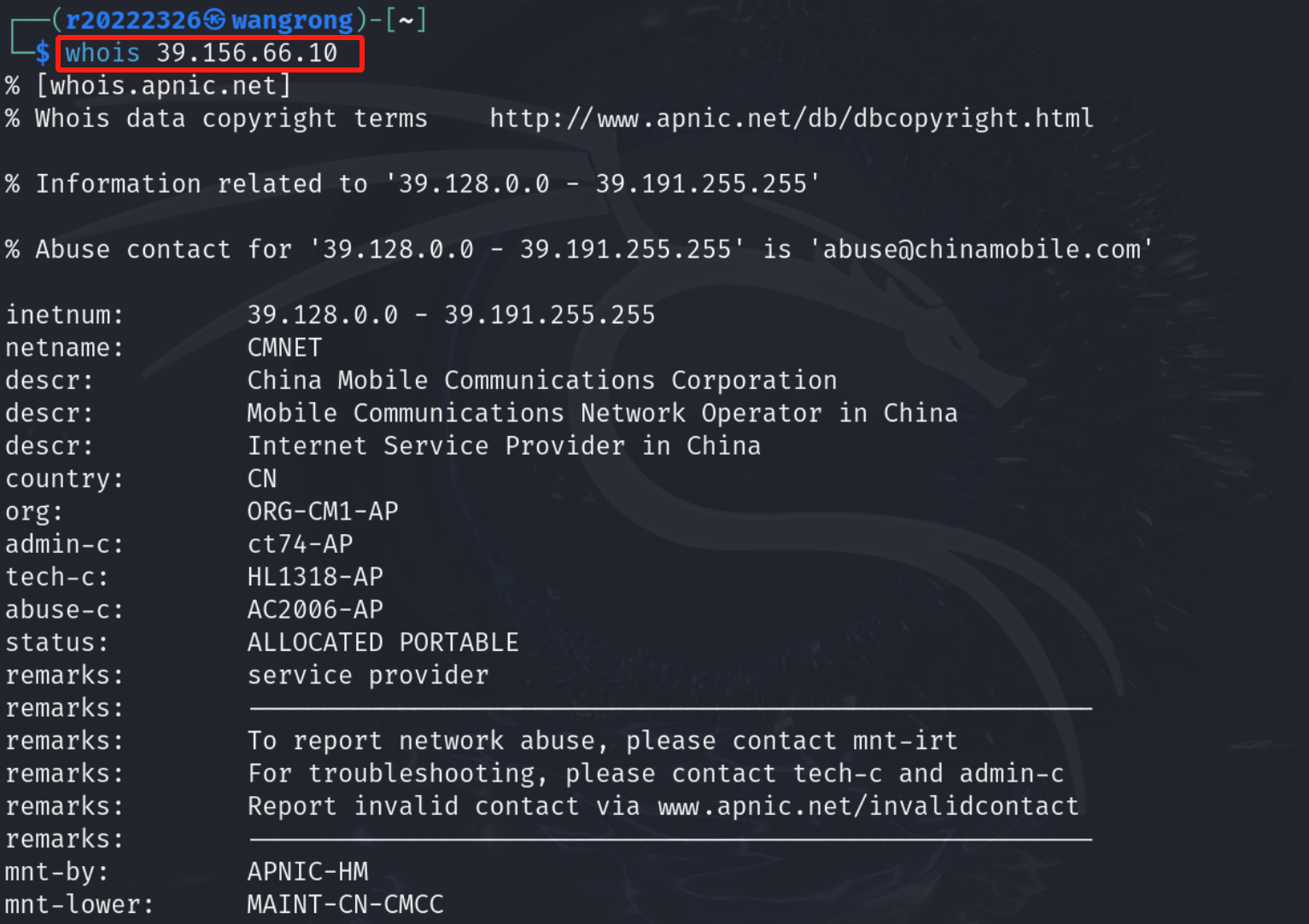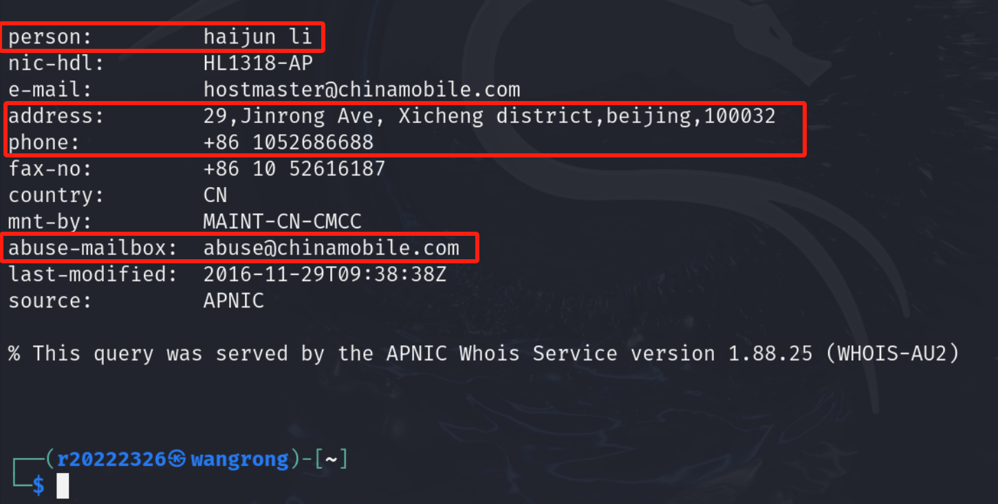 (3)查询IP地址注册人及联系方式 利用whois 39.156.66.10 和 whois 110.242.68.66