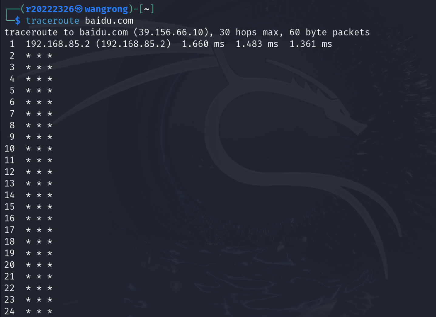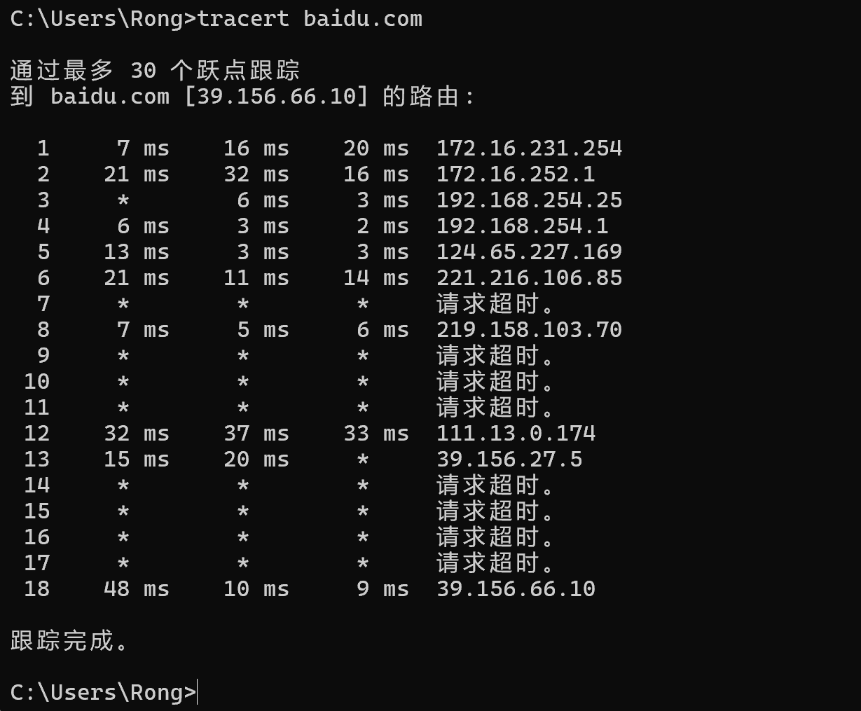 (5)利用traceroute baidu.com和tracert baidu.com来查看从源主机到目标主机经过的路径。
