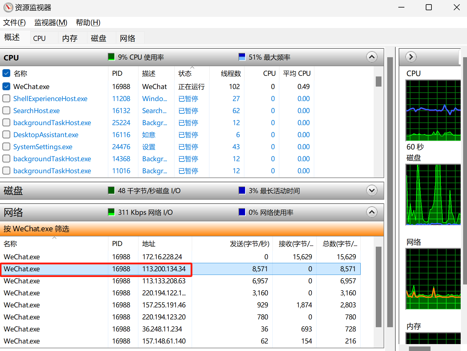 (1)打开一个资源管理器,在电脑上与【微信】好友打一个视频电话(为了在资源监视器中判断哪个是她,发送的信号最多的),在资源管理器中找到好友的IP地址。