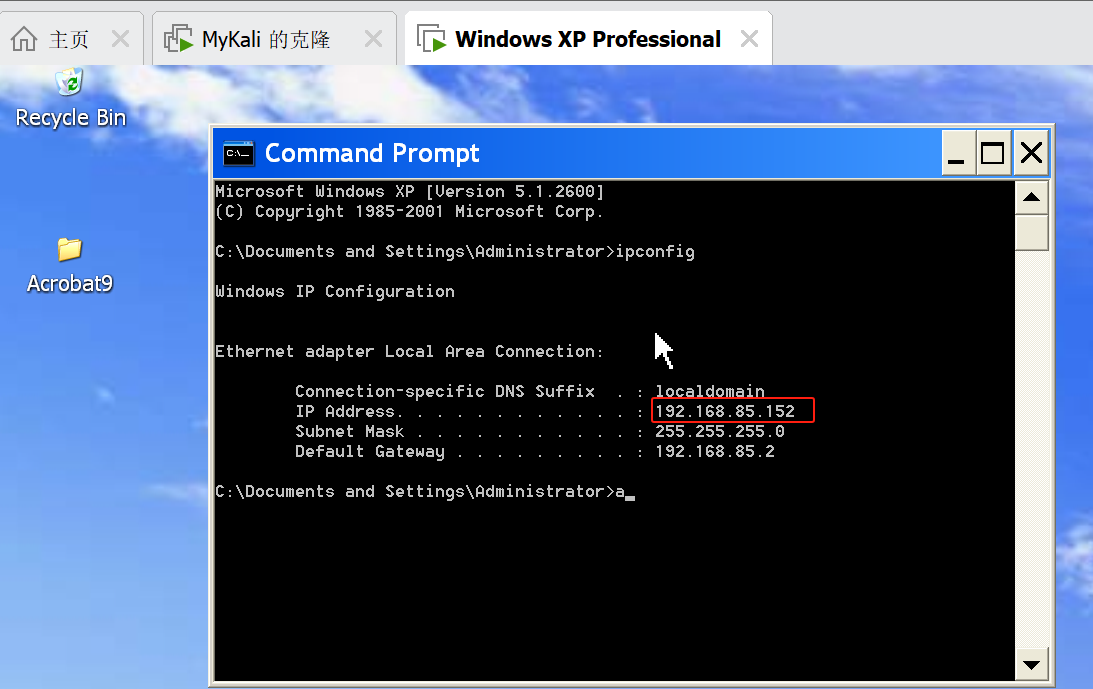 尝试扫描前期准备工作:靶机使用了之前实验的靶机 windows XP 查看IP地址192.168.85.152如下: