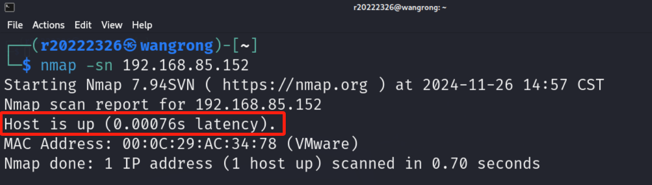 (1)查看靶机IP地址是否活跃 nmap -sn 192.168.85.152