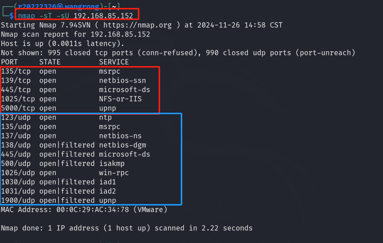 (2)查看靶机开放了哪些TCP和UDP端口 nmap -sT -sU 192.168.85.152