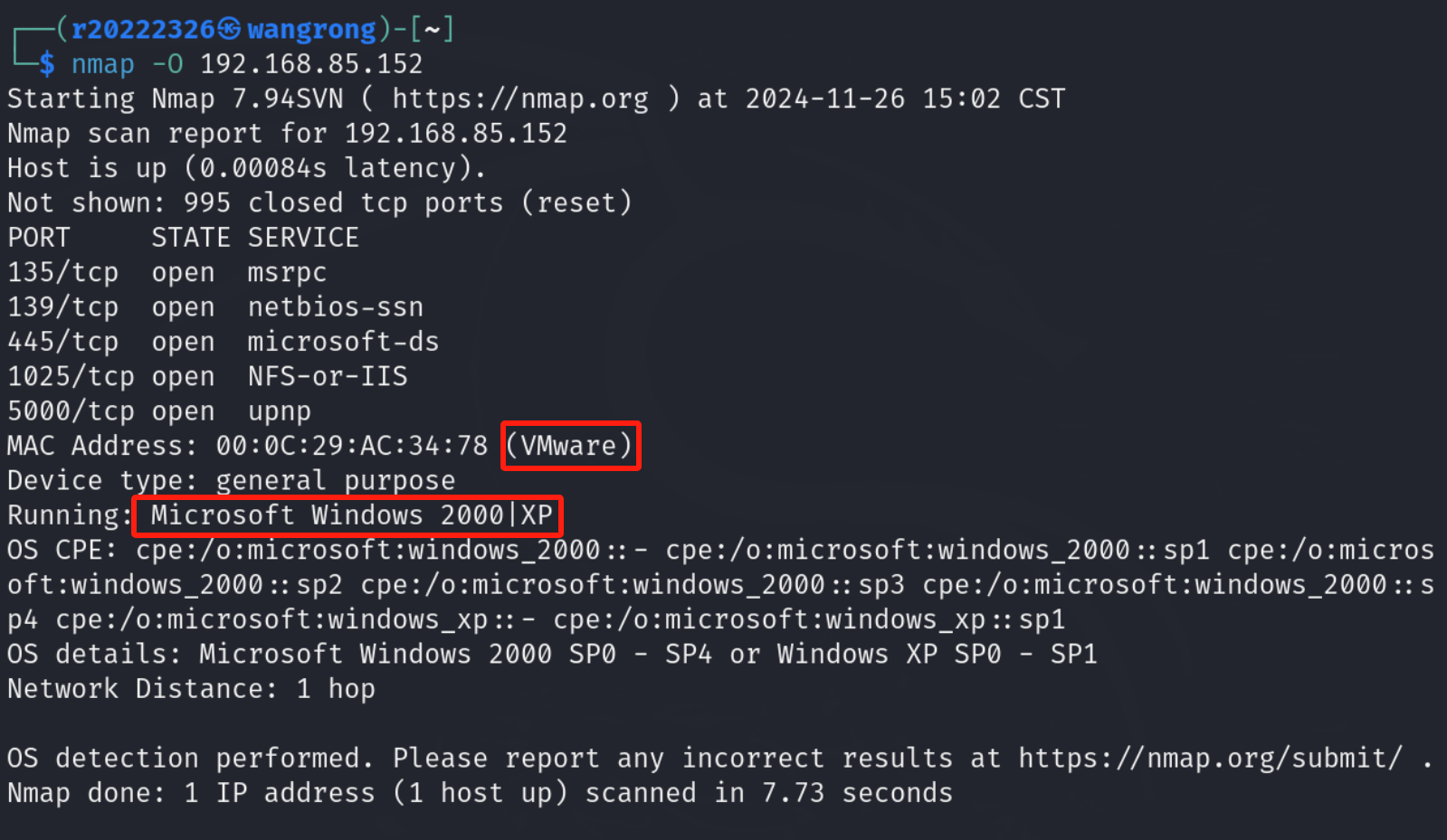 (3)查看靶机安装了什么操作系统,版本是多少 nmap -O 192.168.85.152