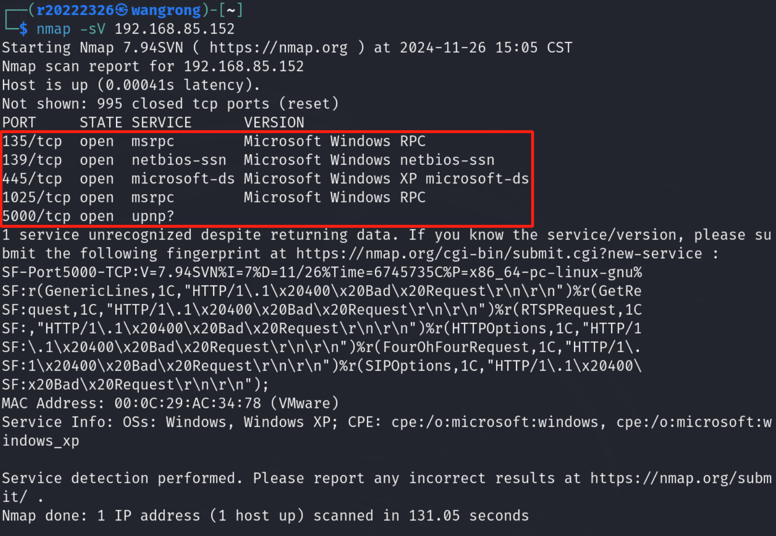 (4)查看靶机上安装了哪些服务 nmap -sV 192.168.85.152