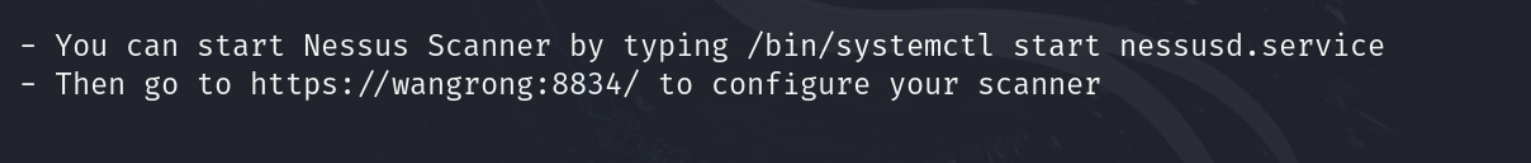 【解压完的提示信息可以知道:启动 Nessus 的命令,以及进行扫描的网址https://wangrong:8834/】