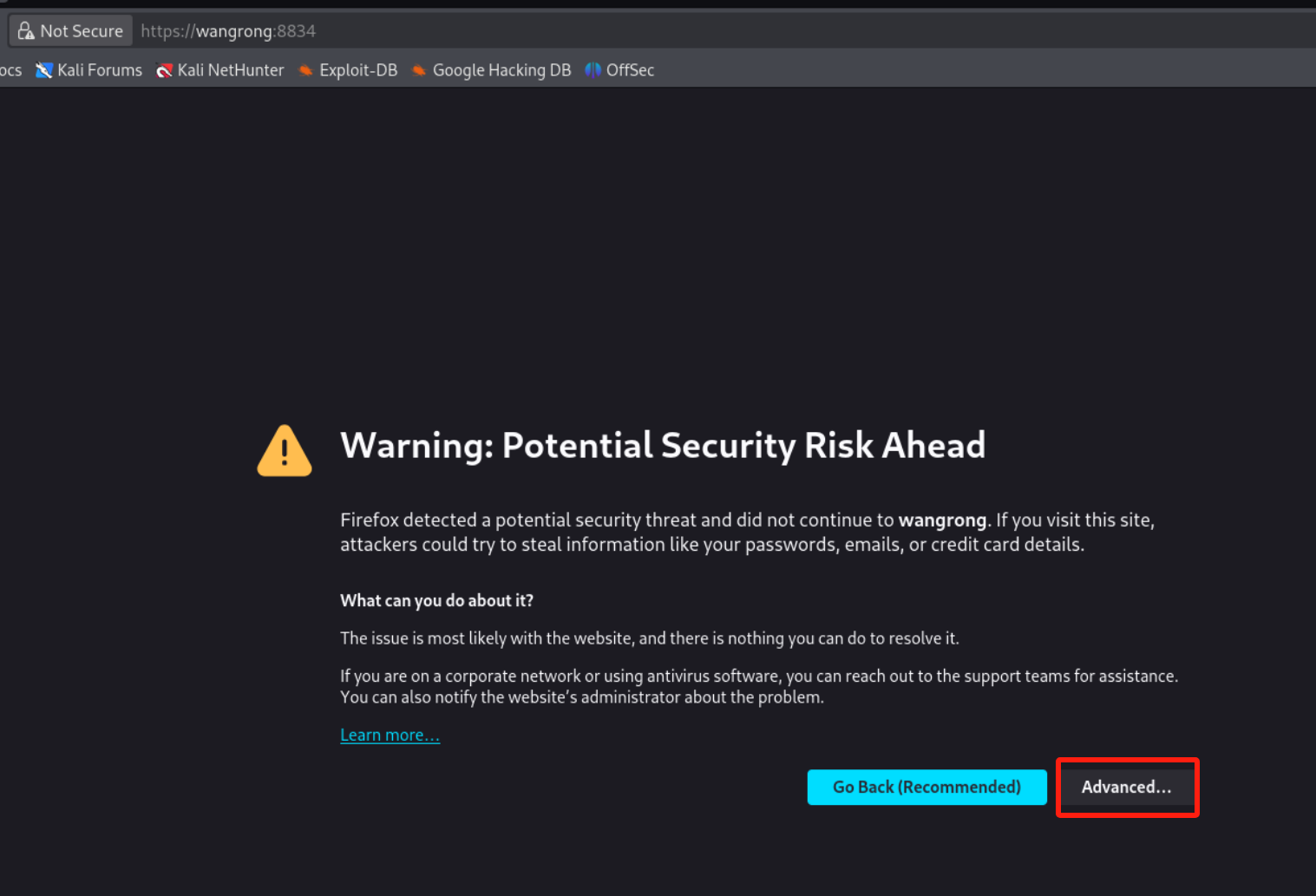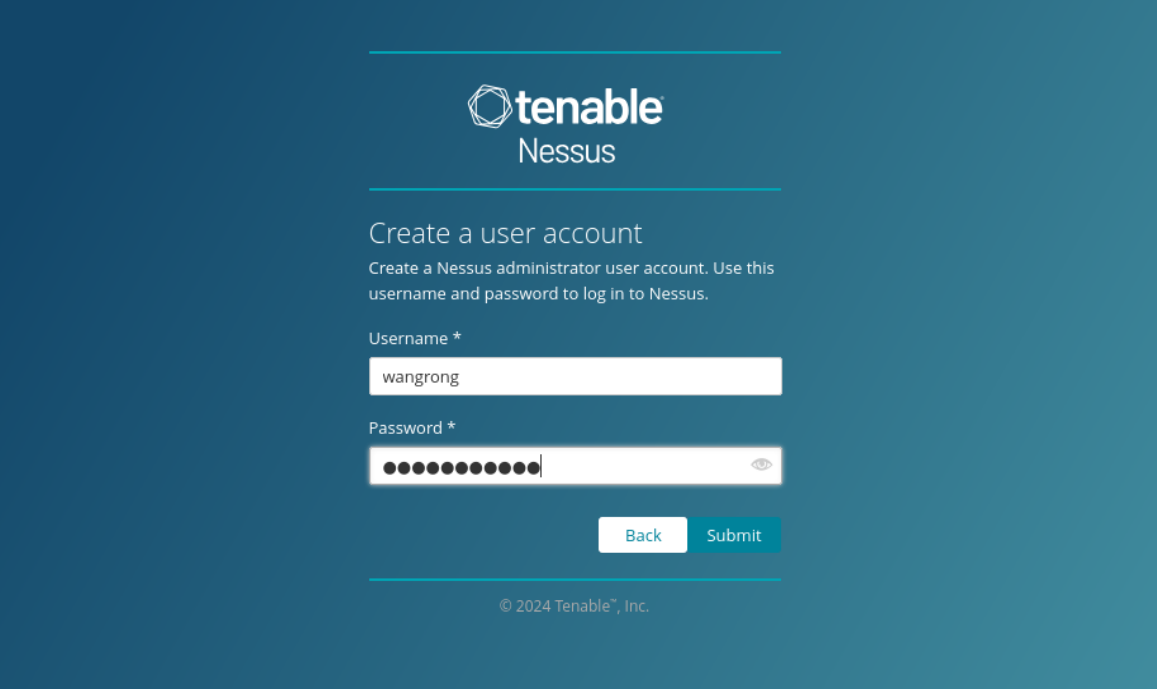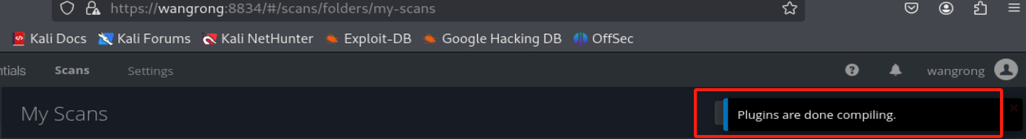 (3)在kali的浏览器中打开https://wangrong:8834/这个网址,先安装,再进行正式的扫描。