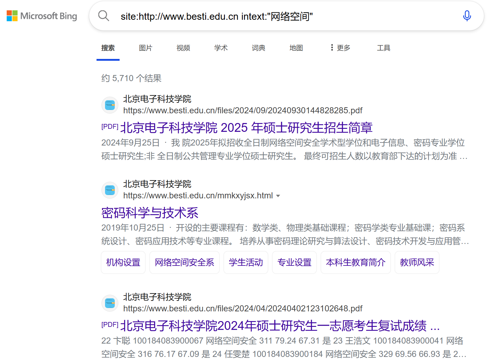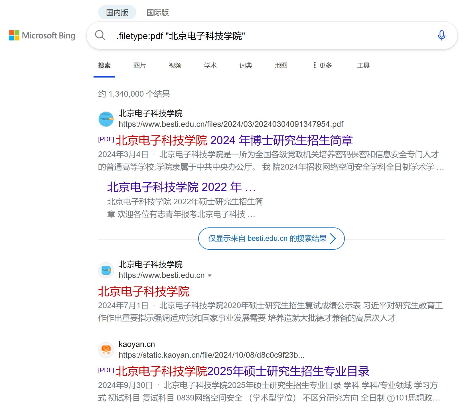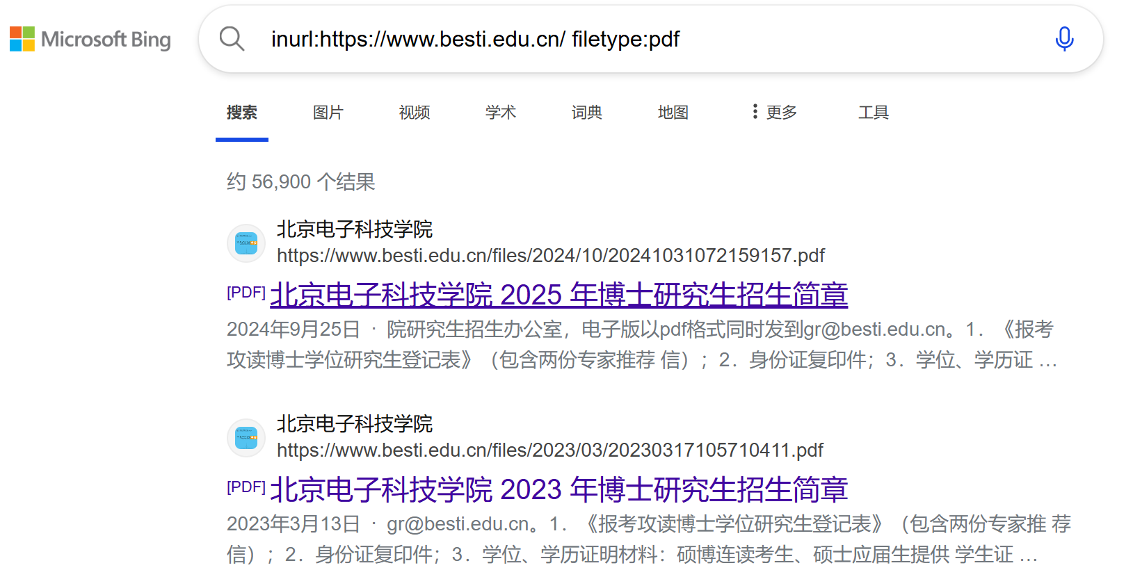 .filetype:pdf "北京电子科技学院":查询包含“北京电子科技学院”这个完整短语的文件