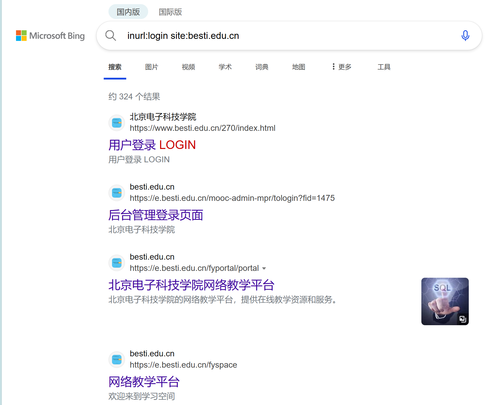 inurl:login site:besti.edu.cn北京电子科技学院网站上所有 URL 中包含 login 的页面.