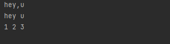 1 print('hey,u') 2 print('hey', 'u') 3 x,y,z = 1,2,3 4 print(x,y,z)