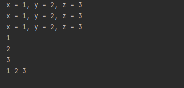 1 x,y,z = 1,2,3 2 print('x = %d, y = %d, z = %d' %(x,y,z)) 3 print('x = {}, y = {}, z = {}'.format(x,y,z)) 4 print(f'x = {x}, y = {y}, z = {z}') 5 6 7 print(x) 8 print(y) 9 print(z) 10 11 12 print(x, end=' ') 13 print(y, end=' ') 14 print(z)