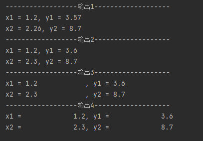 1 x1, y1 = 1.2, 3.57 2 x2, y2 = 2.26, 8.7 3 4 print('{:-^40}'.format('输出1')) 5 print('x1 = {}, y1 = {}'.format(x1, y1)) 6 print('x2 = {}, y2 = {}'.format(x2, y2)) 7 8 9 print('{:-^40}'.format('输出2')) 10 print('x1 = {:.1f}, y1 = {:.1f}'.format(x1, y1)) 11 print('x2 = {:.1f}, y2 = {:.1f}'.format(x2, y2)) 12 13 14 print('{:-^40}'.format('输出3')) 15 print('x1 = {:<15.1f}, y1 = {:<15.1f}'.format(x1, y1)) 16 print('x2 = {:<15.1f}, y2 = {:<15.1f}'.format(x2, y2)) 17 18 19 print('{:-^40}'.format('输出4')) 20 print('x1 = {:>15.1f}, y1 = {:>15.1f}'.format(x1, y1)) 21 print('x2 = {:>15.1f}, y2 = {:>15.1f}'.format(x2, y2))