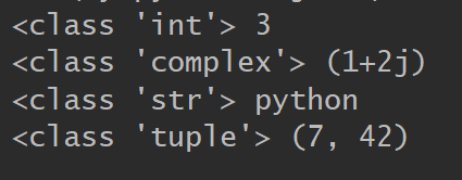 1 r1 = eval('1 + 2') 2 print(type(r1), r1) 3 r2 = eval('1+2j') 4 print(type(r2), r2) 5 r3 = eval('"python"') 6 print(type(r3), r3) 7 r4 = eval('7, 42') 8 print(type(r4), r4)