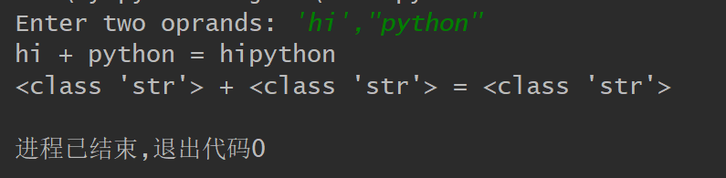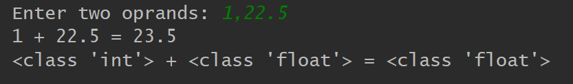 x, y = eval(input('Enter two oprands: ')) ans = x + y print(f'{x} + {y} = {ans}') print(f'{type(x)} + {type(y)} = {type(ans)}')