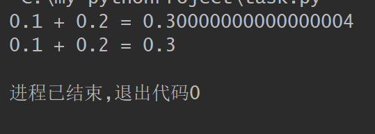 1 ans1 = 0.1 + 0.2 2 print(f'0.1 + 0.2 = {ans1}') 3 4 import decimal 5 6 ans2 = decimal.Decimal('0.1') + decimal.Decimal('0.2') 7 print(f'0.1 + 0.2 = {ans2}')