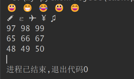 1 print(chr(0x1f600), end = " ") 2 print(chr(0x1f601), end = " ") 3 print(chr(0x1f602), end = " ") 4 print(chr(0x1f603), end = " ") 5 print(chr(0x1f604)) 6 print(chr(10000), end=" ") 7 print(chr(0x025b), end=" ") 8 print(chr(0x2708), end=" ") 9 print(chr(0x00A5), end=" ") 10 print(chr(0x266b)) 11 12 print(ord('a'), end = " ") 13 print(ord('b'), end = " ") 14 print(ord('c')) 15 print(ord('A'), end = " ") 16 print(ord('B'), end = " ") 17 print(ord('C')) 18 print(ord('0'), end = " ") 19 print(ord('1'), end = " ") 20 print(ord('2'))