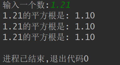 1 import math 2 3 n = float(input('输入一个数:')) 4 5 ans1 = n**0.5 6 ans2 = pow(n, 0.5) 7 ans3 = math.sqrt(n) 8 9 print('%.2f的平方根是: %.2f' %(n, ans1)) 10 print('{:.2f}的平方根是: {:.2f}'.format(n, ans2)) 11 print(f'{n:.2f}的平方根是: {ans3:.2f}')