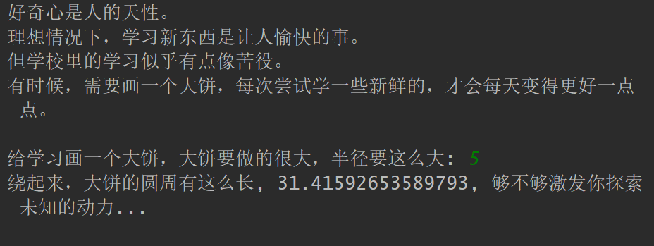 1 import math 2 text = ''' 3 好奇心是人的天性。 4 理想情况下,学习新东西是让人愉快的事。 5 但学校里的学习似乎有点像苦役。 6 有时候,需要画一个大饼,每次尝试学一些新鲜的,才会每天变得更好一点点。 7 ''' 8 print(text) 9 r = float(input('给学习画一个大饼,大饼要做的很大,半径要这么大: ')) 10 circle = 2*math.pi*r 11 print(f'绕起来,大饼的圆周有这么长, {circle}, 够不够激发你探索未知的动力...')
