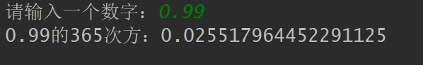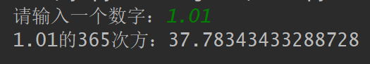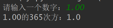1 x = eval(input('请输入一个数字:')) 2 y = x**365 3 print(f'{x:.2f}的365次方:{y}')