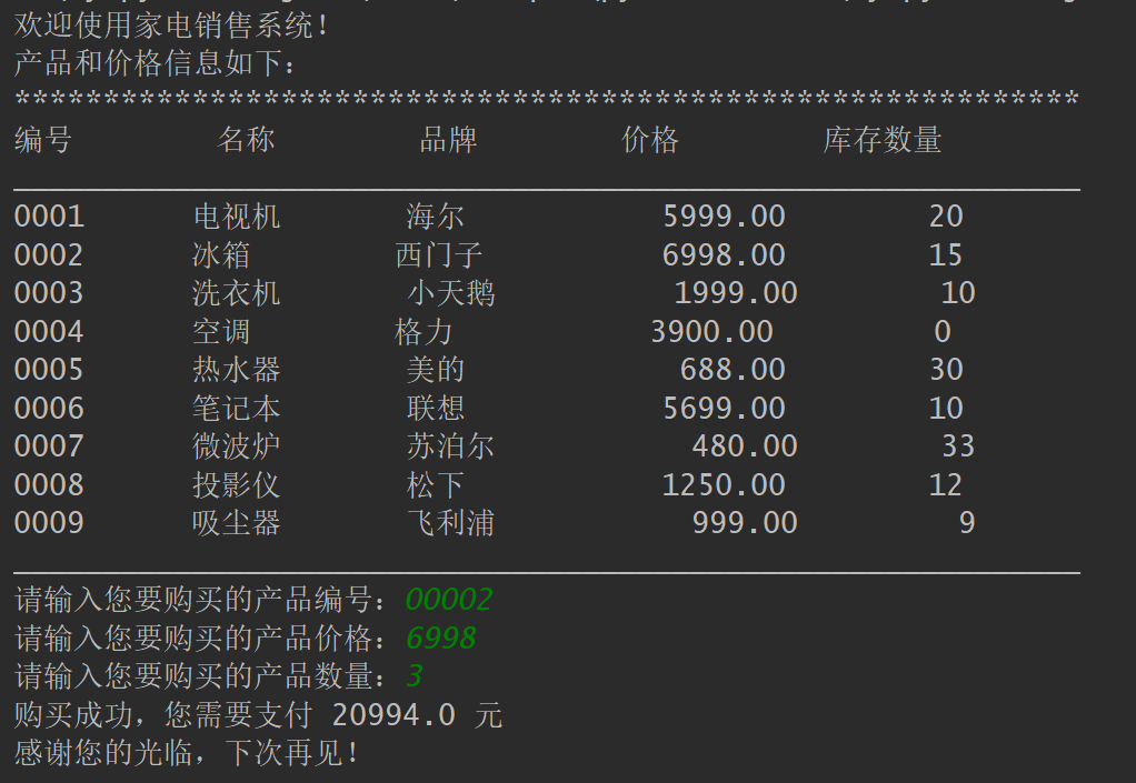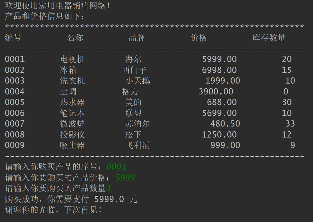 1 print('欢迎使用家电销售系统!') 2 3 4 print('产品和价格信息如下:') 5 print('************************************************************') 6 print(f"{'编号':10s}{'名称':10s}{'品牌':10s}{'价格':10s}{'库存数量':10s}") 7 print('____________________________________________________________') 8 print(f"{'0001':10s}{'电视机':10s}{'海尔':10s}{5999:8.2f}{20:10}") 9 print(f"{'0002':10s}{'冰箱':10s}{'西门子':10s}{6998:8.2f}{15:10}") 10 print(f"{'0003':10s}{'洗衣机':10s}{'小天鹅':10s}{1999:8.2f}{10:10}") 11 print(f"{'0004':10s}{'空调':10s}{'格力':10s}{3900:8.2f}{0:10}") 12 print(f"{'0005':10s}{'热水器':10s}{'美的':10s}{688:8.2f}{30:10}") 13 print(f"{'0006':10s}{'笔记本':10s}{'联想':10s}{5699:8.2f}{10:10}") 14 print(f"{'0007':10s}{'微波炉':10s}{'苏泊尔':10s}{480:8.2f}{33:10}") 15 print(f"{'0008':10s}{'投影仪':10s}{'松下':10s}{1250:8.2f}{12:10}") 16 print(f"{'0009':10s}{'吸尘器':10s}{'飞利浦':10s}{999:8.2f}{9:10}") 17 print('____________________________________________________________') 18 19 20 product_id = input('请输入您要购买的产品编号:') 21 price = float(input('请输入您要购买的产品价格:')) 22 count = int(input('请输入您要购买的产品数量:')) 23 24 25 print('购买成功,您需要支付', price * count, '元') 26 27 print('感谢您的光临,下次再见!')