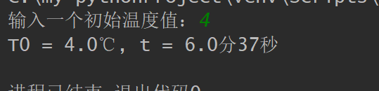 1 p, c, K = eval('1.038, 3.7, 0.0054') 2 M, Tw = eval('67, 100') 3 Ty = int('70') 4 T0 = float(input('输入一个初始温度值:')) 5 6 import math 7 8 pi = math.pi 9 t1 = (M**(2/3))*c*(p**(1/3)) 10 t2 = (K*(pi**2)*(((4*pi)/3)**(2/3))) 11 t3 = ((T0-Tw)/(Ty-Tw))*0.76 12 t4 = math.log(t3) 13 t = (t1/t2)*t4 14 ta = t//60 15 tb = int(t - ta*60 +0.5) 16 print(f'T0 = {T0}℃, t = {ta}分{tb}秒')