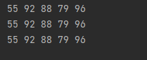 1 lst = [55, 92, 88, 79, 96] 2 i = 0 3 while i < len(lst): 4 print(lst[i], end=' ') 5 i += 1 6 print() 7 8 for i in range(len(lst)): 9 print(lst[i], end=' ') 10 print() 11 12 for i in lst: 13 print(i, end=' ') 14 print()
