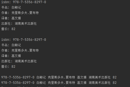 1 book_info = {'isbn': '978-7-5356-8297-0', 2 '书名': '白鲸记', 3 '作者': '克里斯多夫.夏布特', 4 '译者': '高文婧', 5 '出版社': '湖南美术出版社', 6 '售价': 82 7 } 8 for key, value in book_info.items(): 9 print(f'{key}: {value}') 10 print() 11 12 for item in book_info.items(): 13 print(f'{item[0]}: {item[1]}') 14 print() 15 16 for value in book_info.values(): 17 print(value, end = ' ') 18 print() 19 20 for key in book_info.keys(): 21 print(book_info[key], end = ' ')