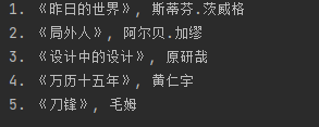 1 book_infos = [{'书名': '昨日的世界', '作者': '斯蒂芬.茨威格'}, 2 {'书名': '局外人', '作者': '阿尔贝.加缪'}, 3 {'书名': '设计中的设计', '作者': '原研哉'}, 4 {'书名': '万历十五年', '作者': '黄仁宇'}, 5 {'书名': '刀锋', '作者': '毛姆'} 6 ] 7 i = 0 8 while i < 5: 9 s = book_infos[i] 10 v1 = s['书名'] 11 v2 = s['作者'] 12 print(f'{i+1}. 《{v1}》, {v2}') 13 i += 1
