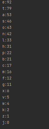 1 test = '''The Zen of Python, by Tim Peters 2 3 Beautiful is better than ugly. 4 Explicit is better than implicit. 5 Simple is better than complex. 6 Complex is better than complicated. 7 Flat is better than nested. 8 Sparse is better than dense. 9 Readability counts. 10 Special cases aren't special enough to break the rules. 11 Although practicality beats purity. 12 Errors should never pass silently. 13 Unless explicitly silenced. 14 In the face of ambiguity, refuse the temptation to guess. 15 There should be one-- and preferably only one --obvious way to do it. 16 Although that way may not be obvious at first unless you're Dutch. 17 Now is better than never. 18 Although never is often better than *right* now. 19 If the implementation is hard to explain, it's a bad idea. 20 If the implementation is easy to explain, it may be a good idea. 21 Namespaces are one honking great idea -- let's do more of those! 22 ''' 23 test1 = test.lower() 24 import string 25 t = list(string.ascii_lowercase) 26 s = {} 27 i = 0 28 while i < 26: 29 ans = test1.count(t[i]) 30 s.update({t[i]:ans}) 31 i += 1 32 f = zip(s.values(),s.keys()) 33 c = sorted(f,reverse=True) 34 a_sorted = dict(c) 35 for item in a_sorted.items(): 36 print(f'{item[1]}:{item[0]}')