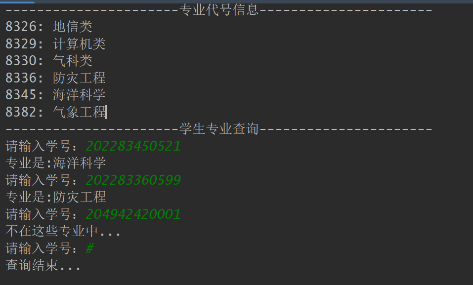 1 code_majors = {'8326' : '地信类', 2 '8329' : '计算机类', 3 '8330' : '气科类', 4 '8336' : '防灾工程', 5 '8345' : '海洋科学', 6 '8382' : '气象工程' 7 } 8 9 print(f'{"专业代号信息":-^50}') 10 for key,value in code_majors.items(): 11 print(f'{key}: {value}') 12 print(f'{"学生专业查询":-^50}') 13 number = input('请输入学号:') 14 while number != '#': 15 if number[4:8] in code_majors: 16 print('专业是:' + code_majors[number[4:8]]) 17 number = input('请输入学号:') 18 19 else: 20 print('不在这些专业中...') 21 number = input('请输入学号:') 22 else: 23 print('查询结束...')