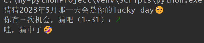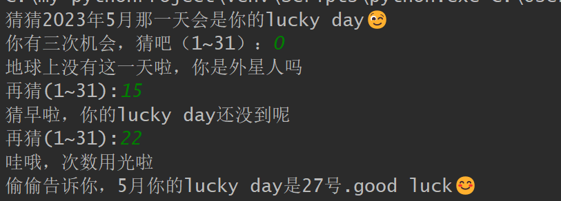 1 import random 2 lst = [random.randint(1, 31) for i in range(1)] 3 mdays = [i for i in range(1,32)] 4 print('猜猜2023年5月那一天会是你的lucky day' + chr(0x1f609)) 5 day = input('你有三次机会,猜吧(1~31):') 6 i = 1 7 while i <= 2: 8 if int(day) in mdays: 9 if int(day) < lst[0]: 10 print('猜早啦,你的lucky day还没到呢') 11 day = input('再猜(1~31):') 12 i += 1 13 elif int(day) > lst[0]: 14 print('猜晚啦,你的lucky day已经过啦') 15 day = input('再猜(1~31):') 16 i += 1 17 else: 18 print(f'哇,猜中了{chr(0x1f923)}') 19 break 20 21 else: 22 print('地球上没有这一天啦,你是外星人吗') 23 day = input('再猜(1~31):') 24 i += 1 25 else: 26 print('哇哦,次数用光啦') 27 print(f'偷偷告诉你,5月你的lucky day是{lst[0]}号.good luck{chr(0x1f60a)}')