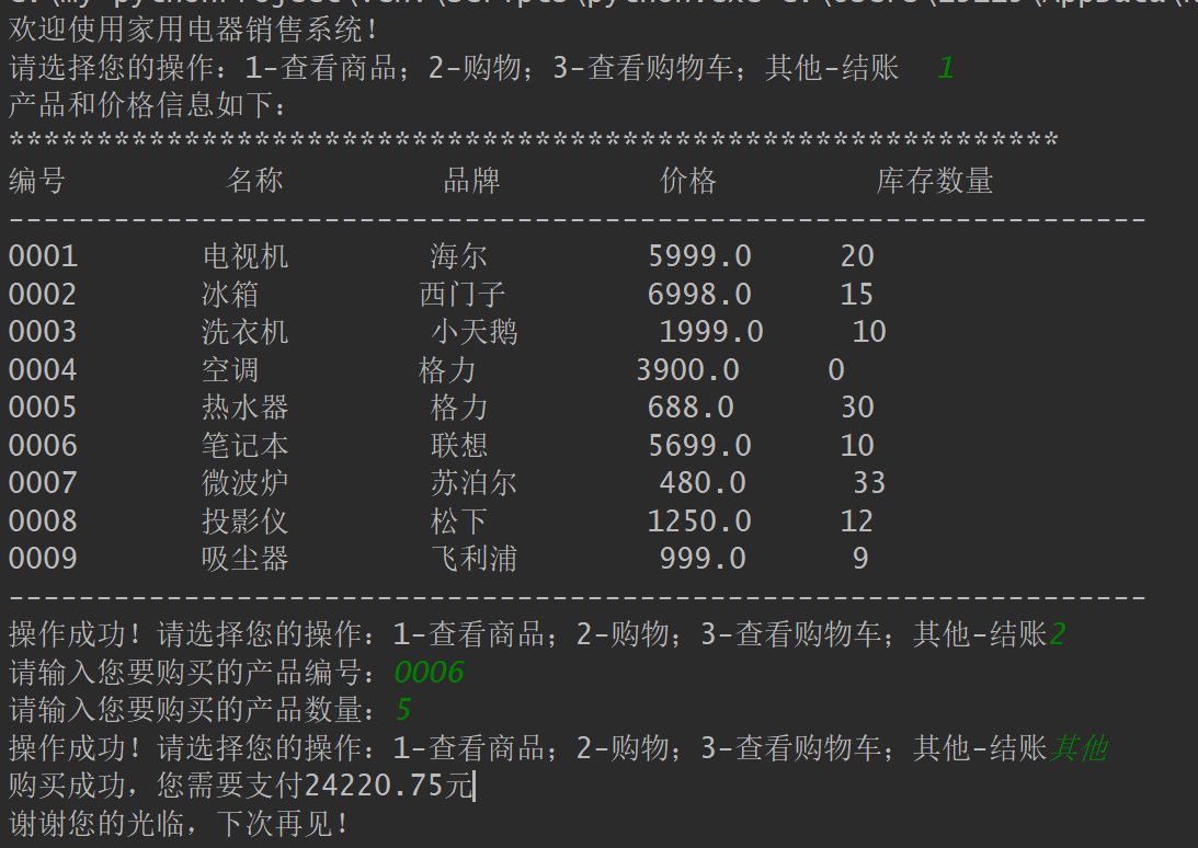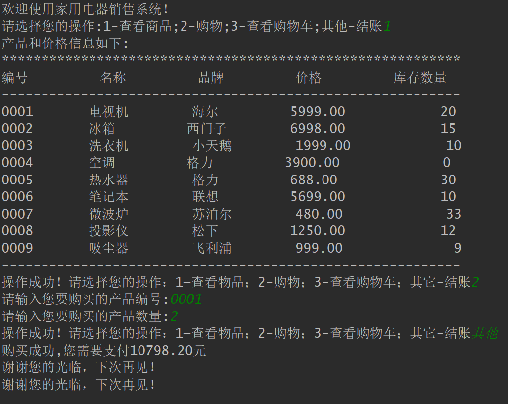 1 """ 2 家用电器销售系统 3 v1.3 4 """ 5 #欢迎信息 6 print('欢迎使用家用电器销售系统!') 7 #商品数据初始化 8 products=[ 9 ['0001','电视机','海尔',5999.00,20], 10 ['0002','冰箱','西门子',6998.00,15], 11 ['0003','洗衣机','小天鹅',1999.00,10], 12 ['0004','空调','格力',3900.00,0], 13 ['0005','热水器','格力',688.00,30], 14 ['0006','笔记本','联想',5699.00,10], 15 ['0007','微波炉','苏泊尔',480.00,33], 16 ['0008','投影仪','松下',1250.00,12], 17 ['0009','吸尘器','飞利浦',999.00,9], 18 ] 19 #初始化用户购物车 20 products_cart=[] 21 option=input('请选择您的操作:1-查看商品;2-购物;3-查看购物车;其他-结账') 22 while option in ['1','2','3']: 23 if option=='1': 24 #产品信息列表 25 print('产品和价格信息如下:') 26 print('**********************************************************') 27 print('{:<10} {:<10} {:<10} {:<10} {:<10}'.format('编号','名称','品牌','价格','库存数量')) 28 print('----------------------------------------------------------') 29 for i in range(len(products)): 30 print('{:<10}'.format(products[i][0]),'{:<10}'.format(products[i][1]),'{:<10}'.format(products[i][2]),'{:<10.2f}'.format(products[i][3]),'{:>10}'.format(products[i][4])) 31 print('----------------------------------------------------------') 32 elif option=='2': 33 product_id= input('请输入您要购买的产品编号:') 34 while product_id not in[item[0] for item in products]: 35 product_id=input('编号不存在,请重新输入您要购买的产品编号:') 36 37 count=int(input('请输入您要购买的产品数量:')) 38 while count> products[int( product_id)-1][4]: 39 count=int(input('数量超出库存,请重新输入您要购买的产品数量:')) 40 41 #将所购买商品加入购物车 42 if product_id not in [item[0] for item in products_cart]: 43 products_cart.append([product_id,count]) 44 else: 45 for i in range(len(products_cart)): 46 if products_cart[i][0]==product_id: 47 products_cart[i][1]+=count 48 49 #更新商品列表 50 for i in range(len(products)): 51 if products[i][0]==product_id: 52 products[i][4]-=count 53 else: 54 print('购物车信息如下:') 55 print('***********************************************************') 56 print('{:<10} {:<10} '.format('编号','购买数量')) 57 print('----------------------------------------------------------') 58 for i in range(len(products_cart)): 59 print('{:10s}'.format(products_cart[i][0]),'{:6d}'.format(products_cart[i][1])) 60 print('----------------------------------------------------------') 61 option=input('操作成功!请选择您的操作:1—查看物品;2-购物;3-查看购物车;其它-结账') 62 #计算金额 63 if len( products_cart)>0: 64 amount=0 65 for i in range( len( products_cart)): 66 product_index=0 67 for j in range(len(products)): 68 if products[j][0]== products_cart[i][0]: 69 product_index=j 70 break 71 price= products[ product_index][3] 72 count= products_cart[i][1] 73 amount+=price*count 74 if 5000<amount<=10000: 75 amount=amount*0.95 76 elif 10000<amount <=20000: 77 amount=amount*0.90 78 elif amount>20000: 79 amount=amount*0.85 80 else: 81 amount=amount*1 82 print('购买成功,您需要支付%8.2f元'%amount) 83 #退出系统 84 print('谢谢您的光临,下次再见!') 85 print('谢谢您的光临,下次再见!')
