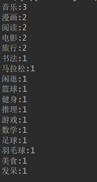 1 datas = {'2049777001': ['篮球', '羽毛球', '美食', '漫画'], 2 '2049777002': ['音乐', '旅行'], 3 '2049777003': ['马拉松', '健身', '游戏'], 4 '2049777004': [], 5 '2049777005': ['足球', '阅读'], 6 '2049777006': ['发呆', '闲逛'], 7 '2049777007': [], 8 '2049777008': ['书法', '电影'], 9 '2049777009': ['音乐', '阅读', '电影', '漫画'], 10 '2049777010': ['数学', '推理', '音乐', '旅行'] 11 } 12 lst1 = list(datas.items()) 13 lst2 = [] 14 i = 0 15 while i < len(lst1): 16 lst2.append(lst1[i][1]) 17 i += 1 18 lst3 = [] 19 for a in range(0,len(lst2)): 20 for b in range(0,len(lst2[a])): 21 lst3.append(lst2[a][b]) 22 lst4 = list(set(lst3)) 23 d = {} 24 for i in range(len(lst4)): 25 t = {lst4[i]:lst3.count(lst4[i])} 26 d.update(t) 27 d1 = sorted(d.items(), key = lambda x:x[1], reverse = True) 28 for i in d1: 29 print(f'{i[0]}:{i[1]}')