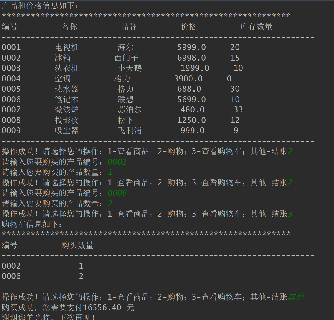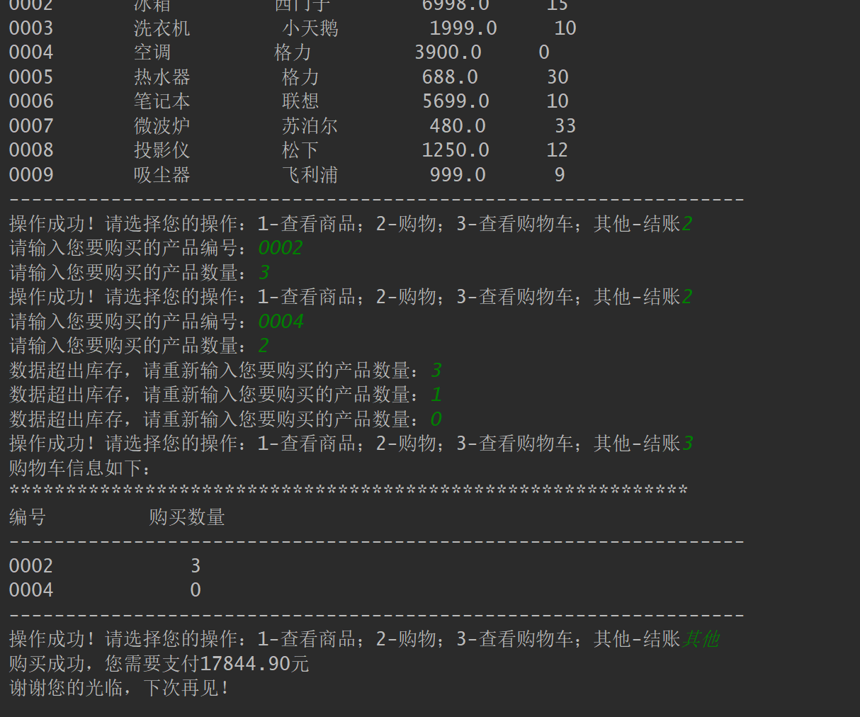 1 """ 2 家用电器销售系统 3 v1.4 4 """ 5 6 #欢迎信息 7 print('欢迎使用家用电器销售系统!') 8 9 #商品数据初始化 10 products = [ 11 {'id':"0001", 'name':'电视机', 'brand':'海尔', 'price':5999.00, 'count':20}, 12 {'id':"0002", 'name':'冰箱', 'brand':'西门子', 'price':6998.00, 'count':15}, 13 {'id':"0003", 'name':'洗衣机', 'brand':'小天鹅', 'price':1999.00, 'count':10}, 14 {'id':"0004", 'name':'空调', 'brand':'格力', 'price':3900.00, 'count':0}, 15 {'id':"0005", 'name':'热水器', 'brand':'格力', 'price':688.00, 'count':30}, 16 {'id':"0006", 'name':'笔记本', 'brand':'联想', 'price':5699.00, 'count':10}, 17 {'id':"0007", 'name':'微波炉', 'brand':'苏泊尔', 'price':480.00, 'count':33}, 18 {'id':"0008", 'name':'投影仪', 'brand':'松下', 'price':1250.00, 'count':12}, 19 {'id':"0009", 'name':'吸尘器', 'brand':'飞利浦', 'price':999.00, 'count':9} 20 ] 21 22 #初始化购物车 23 products_cart = [] 24 25 option = input('请选择您的操作:1-查看商品;2-购物;3-查看购物车;其他-结账 ') 26 while option in ['1','2','3']: 27 if option == '1': 28 #产品信息列表 29 print('产品和价格信息如下:') 30 print('*' * 60) 31 print(f"{'编号': <10} {'名称': <10} {'品牌': <10} {'价格': <10} {'库存数量': <10} ") 32 print('-' * 65) 33 for i in range(len(products)): 34 print(f"{products[i]['id']: <10} {products[i]['name']: <10} {products[i]['brand']: <10} {products[i]['price']: <10} {products[i]['count']: <10}") 35 print('-' * 65) 36 elif option == '2': 37 products_id = input('请输入您要购买的产品编号:') 38 while products_id not in [item['id'] for item in products]: 39 products_id = input('编号不存在,请重新输入您要购买的产品编号:') 40 41 count = int(input('请输入您要购买的产品数量:')) 42 while count > products[int(products_id) - 1]['count']: 43 count = int(input('数据超出库存,请重新输入您要购买的产品数量:')) 44 45 #将所购买商品加入购物车 46 if products_id not in [item['id'] for item in products_cart]: 47 products_cart.append({'id':products_id, 'count':count}) 48 else: 49 for i in range(len(products_cart)): 50 if products_cart[i].get('id') == products_id: 51 products_cart[i]['count'] += count 52 53 #更新商品列表 54 for i in range(len(products)): 55 if products[i]['id'] == products_id: 56 products[i]['count'] -= count 57 58 else: 59 print('购物车信息如下:') 60 print('*' * 60) 61 print(f"{'编号': <10} {'购买数量': <10}") 62 print('-' * 65) 63 for i in range(len(products_cart)): 64 print(f"{products_cart[i]['id']: <10} {products_cart[i]['count']: > 6}") 65 print('-' * 65) 66 option = input('操作成功!请选择您的操作:1-查看商品;2-购物;3-查看购物车;其他-结账') 67 68 #计算金额 69 if len(products_cart) > 0: 70 amount = 0 71 for i in range(len(products_cart)): 72 product_index = 0 73 for j in range(len(products)): 74 if products[j]['id'] == products_cart[i]['id']: 75 product_index = j 76 break 77 price = products[product_index]['price'] 78 count = products_cart[i]['count'] 79 amount += price * count 80 81 if 5000 < amount <= 10000: 82 amount = amount * 0.95 83 elif 10000 < amount <= 20000: 84 amount = amount * 0.90 85 elif amount > 20000: 86 amount = amount * 0.85 87 else: 88 amount = amount * 1 89 print(f'购买成功,您需要支付{amount:.2f}元') 90 91 #退出系统 92 print('谢谢您的光临,下次再见!')