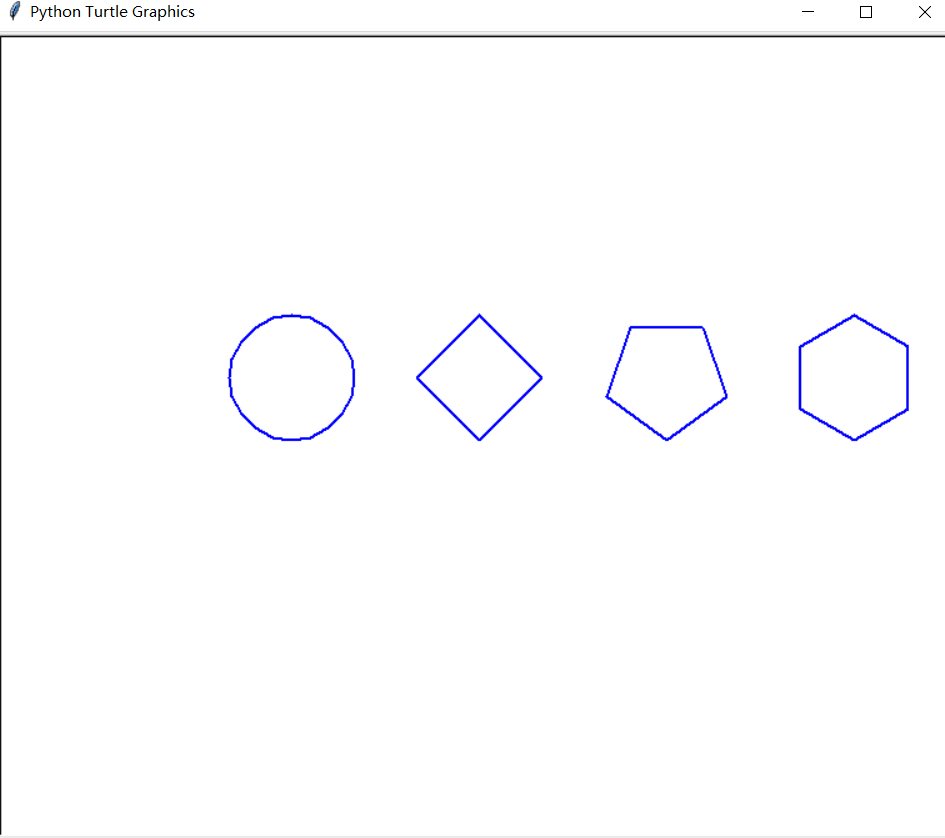 1 from turtle import * 2 def moveto(x, y): 3 penup() 4 goto(x, y) 5 pendown() 6 def main(): 7 pensize(2) 8 pencolor('blue') 9 moveto(-150, 0) 10 circle(50) 11 moveto(0, 0) 12 circle(50, steps = 4) 13 moveto(150, 0) 14 circle(50, steps = 5) 15 moveto(300, 0) 16 circle(50, steps = 6) 17 hideturtle() 18 done() 19 main()