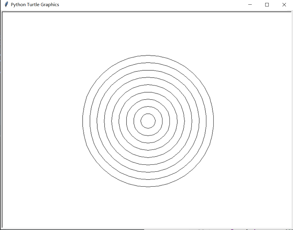 1 from turtle import * 2 def moveto(x, y): 3 penup() 4 goto(x, y) 5 pendown() 6 def main(): 7 setup(800, 600) 8 radius = 20 9 offset = 20 10 for i in range(9): 11 moveto(0, -radius) 12 circle(radius) 13 radius += offset 14 hideturtle() 15 done() 16 main()