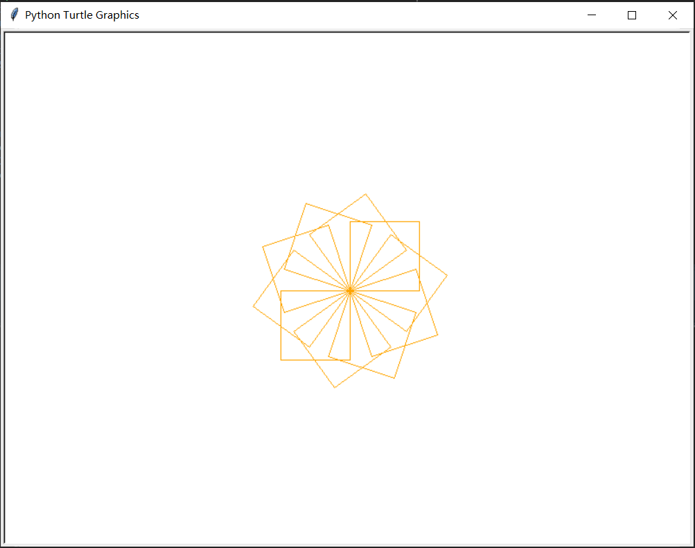 1 from turtle import * 2 def square(size = 50, rgb = 'orange'): 3 pencolor(rgb) 4 for i in range(4): 5 fd(size) 6 left(90) 7 def main(): 8 setup(800, 600) 9 speed(0) 10 n =10 11 for i in range(n): 12 square(80) 13 left(360/n) 14 hideturtle() 15 done() 16 main()
