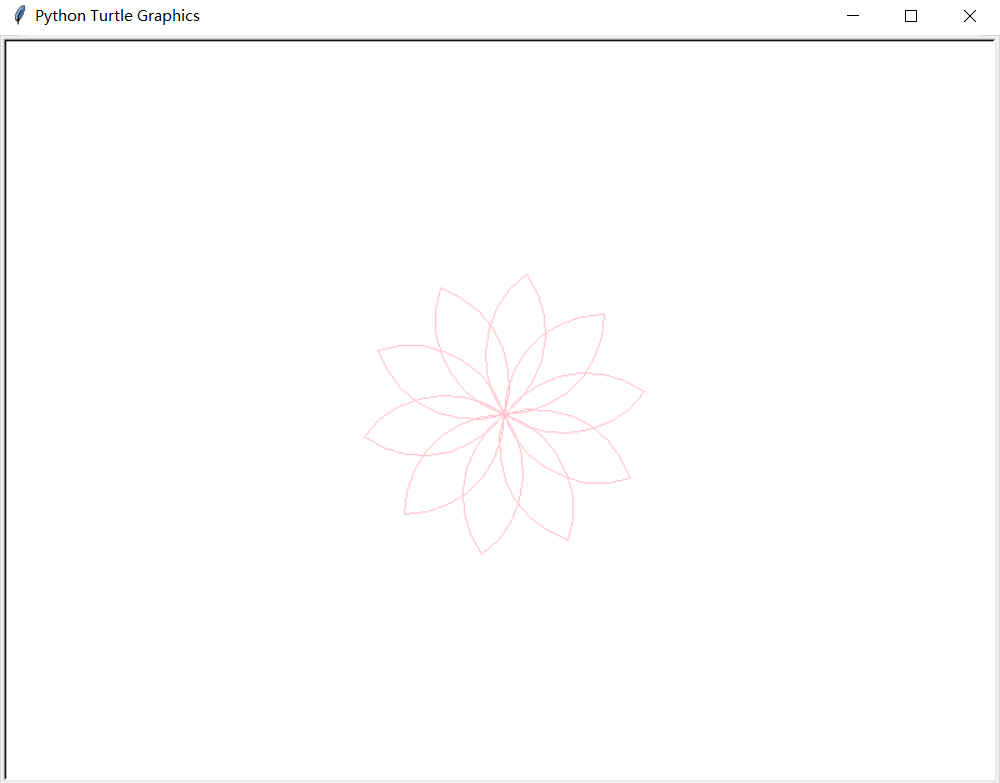 1 from turtle import * 2 speed(0) 3 setup(800, 600) 4 pencolor('pink') 5 n = 10 6 for i in range(n): 7 for j in range(2): 8 circle(80, 90) 9 left(90) 10 right(360/n) 11 hideturtle() 12 done()