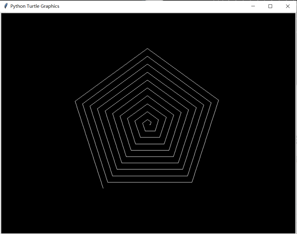 1 from turtle import * 2 setup(800, 600) 3 bgcolor('black') 4 pencolor('white') 5 speed(0) 6 7 angle = 0 8 size = 2 9 10 n = 5 #改 11 count = 50 12 for i in range(count): 13 fd(size) 14 angle += 360/n #改 15 seth(angle) 16 size += 5 17 18 hideturtle() 19 done()