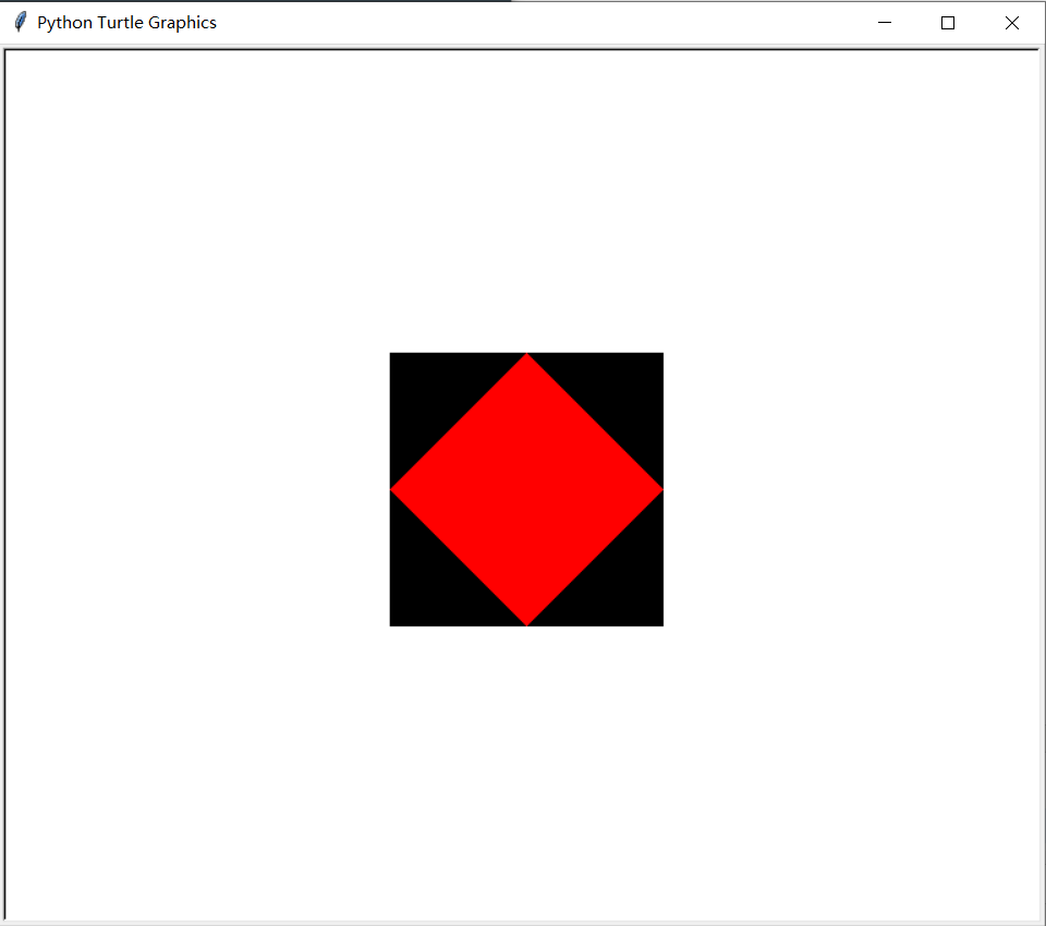 1 #5 2 from turtle import * 3 4 penup() 5 goto(-100,-100) 6 pendown() 7 color('black') 8 begin_fill() 9 for i in range(4): 10 forward(200) 11 left(90) 12 end_fill() 13 14 penup() 15 goto(0,-100) 16 pendown() 17 left(45) 18 color('red') 19 begin_fill() 20 for i in range(4): 21 forward(100*2**(0.5)) 22 left(90) 23 end_fill() 24 25 hideturtle() 26 done()