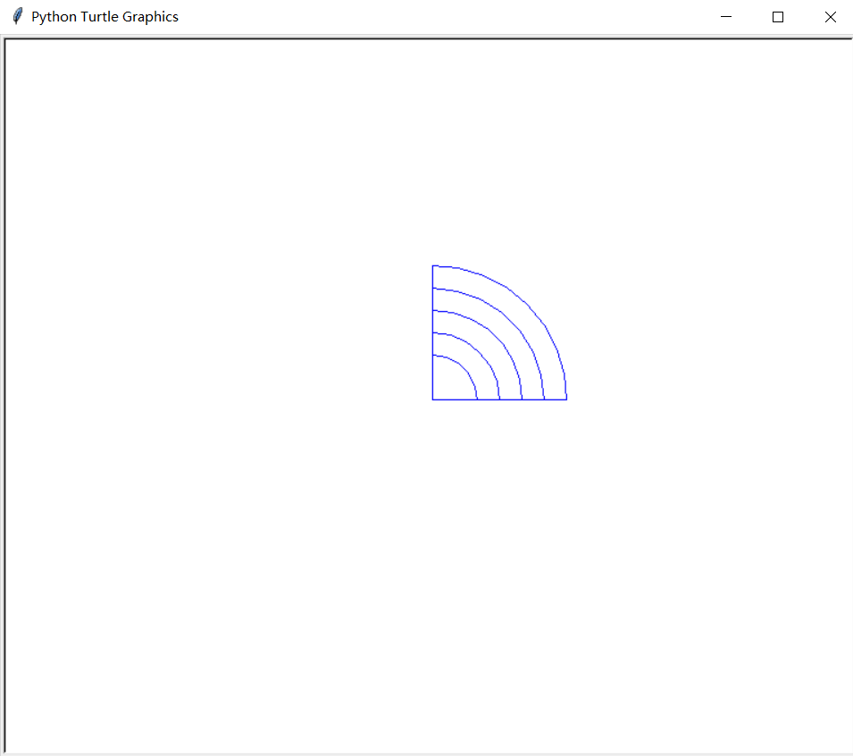 1 from turtle import * 2 color('blue') 3 r = 20 4 for i in range(5): 5 r += 20 6 forward(r) 7 left(90) 8 circle(r,90) 9 left(90) 10 forward(r) 11 left(90) 12 forward(40) 13 goto(0,0) 14 hideturtle() 15 done()