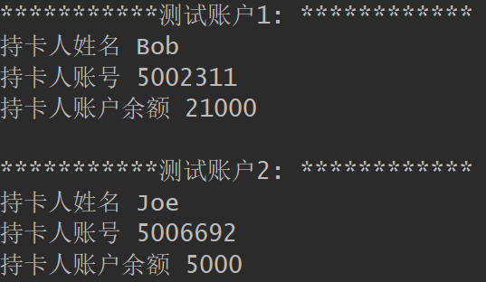 1 class Account: 2 def __init__(self,name,account_number,initial_amount = 10): 3 self._name = name 4 self._card_no = account_number 5 self._balance = initial_amount 6 7 def deposit(self,amount): 8 self._balance += amount 9 def withdraw(self,amount): 10 if self._balance < amount: 11 print('余额不足') 12 return 13 14 self._balance -= amount 15 def info(self): 16 print('持卡人姓名', self._name) 17 print('持卡人账号', self._card_no) 18 print('持卡人账户余额', self._balance) 19 def get_balance(self): 20 return self._balance 21 22 def main(): 23 print('测试账户1: '.center(30,'*')) 24 a1 = Account('Bob','5002311',20000) 25 a1.deposit(5000) 26 a1.withdraw(4000) 27 a1.info() 28 29 print() 30 31 print('测试账户2: '.center(30,'*')) 32 a2 = Account('Joe','5006692',20000) 33 a2.withdraw(10000) 34 a2.withdraw(5000) 35 a2.info() 36 37 if __name__ == '__main__': 38 main()