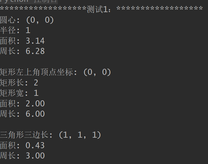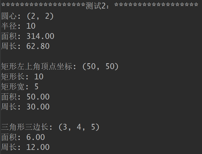 1 class Shape: 2 def info(self): 3 pass 4 def area(self): 5 pass 6 def preimeter(self): 7 pass 8 class Rect(Shape):#矩形类 9 def __init__(self, x = 0, y = 0, length = 2, width = 1): 10 self._x = x 11 self._y = y 12 self._width = width 13 self._length = length 14 def info(self):#打印图片信息 15 print(f'矩形左上角顶点坐标: ({self._x}, {self._y})') 16 print(f'矩形长: {self._length}') 17 print(f'矩形宽: {self._width}') 18 def area(self):#面积 19 return self._length * self._width 20 def perimeter(self):#周长 21 return (self._length + self._width) * 2 22 class Circle(Shape): 23 def __init__(self, x = 0, y = 0, radius = 1): 24 self._x = x 25 self._y = y 26 self._r = radius 27 def info(self): 28 print(f'圆心: ({self._x}, {self._y})') 29 print(f'半径: {self._r}') 30 def area(self): 31 return 3.14 * self._r * self._r 32 def perimeter(self): 33 return 2 * 3.14 * self._r 34 class Triangle(Shape): 35 def __init__(self, a = 1, b = 1, c = 1): 36 self._a, self._b, self._c = a, b, c 37 def info(self): 38 print(f'三角形三边长: ({self._a}, {self._b}, {self._c})') 39 def area(self): 40 s = (self._a + self._b + self._c) / 2 41 ans = (s*(s - self._a)*(s - self._b)*(s - self._c)) ** 0.5 42 return ans 43 def perimeter(self): 44 return (self._a + self._b + self._c) 45 def main(): 46 print('测试1:'.center(40, '*')) 47 shapes_lst1 = [Circle(), Rect(), Triangle()] 48 for t in shapes_lst1: 49 t.info() 50 print(f'面积: {t.area():.2f}') 51 print(f'周长: {t.perimeter():.2f}') 52 print() 53 print('测试2:'.center(40, '*')) 54 shapes_lst2 = [Circle(x = 2, y = 2, radius = 10), 55 Rect(x = 50, y = 50, length = 10, width = 5), 56 Triangle(a = 3, b = 4, c = 5)] 57 for t in shapes_lst2: 58 t.info() 59 print(f'面积: {t.area():.2f}') 60 print(f'周长: {t.perimeter():.2f}') 61 print() 62 if __name__ == '__main__': 63 main()