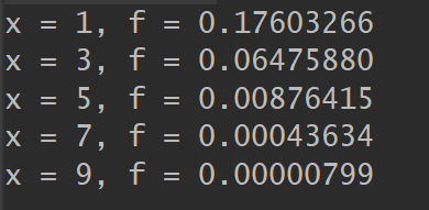 1 from math import* 2 3 def func(x): 4 m = 0 5 s = 2 6 a = 1/(s* (2*pi)**0.5) 7 b = exp(-0.5* (x/s)**2) 8 return a*b 9 10 for i in [1,3,5,7,9]: 11 print(f'x = {i}, f = {func(i):.8f}')