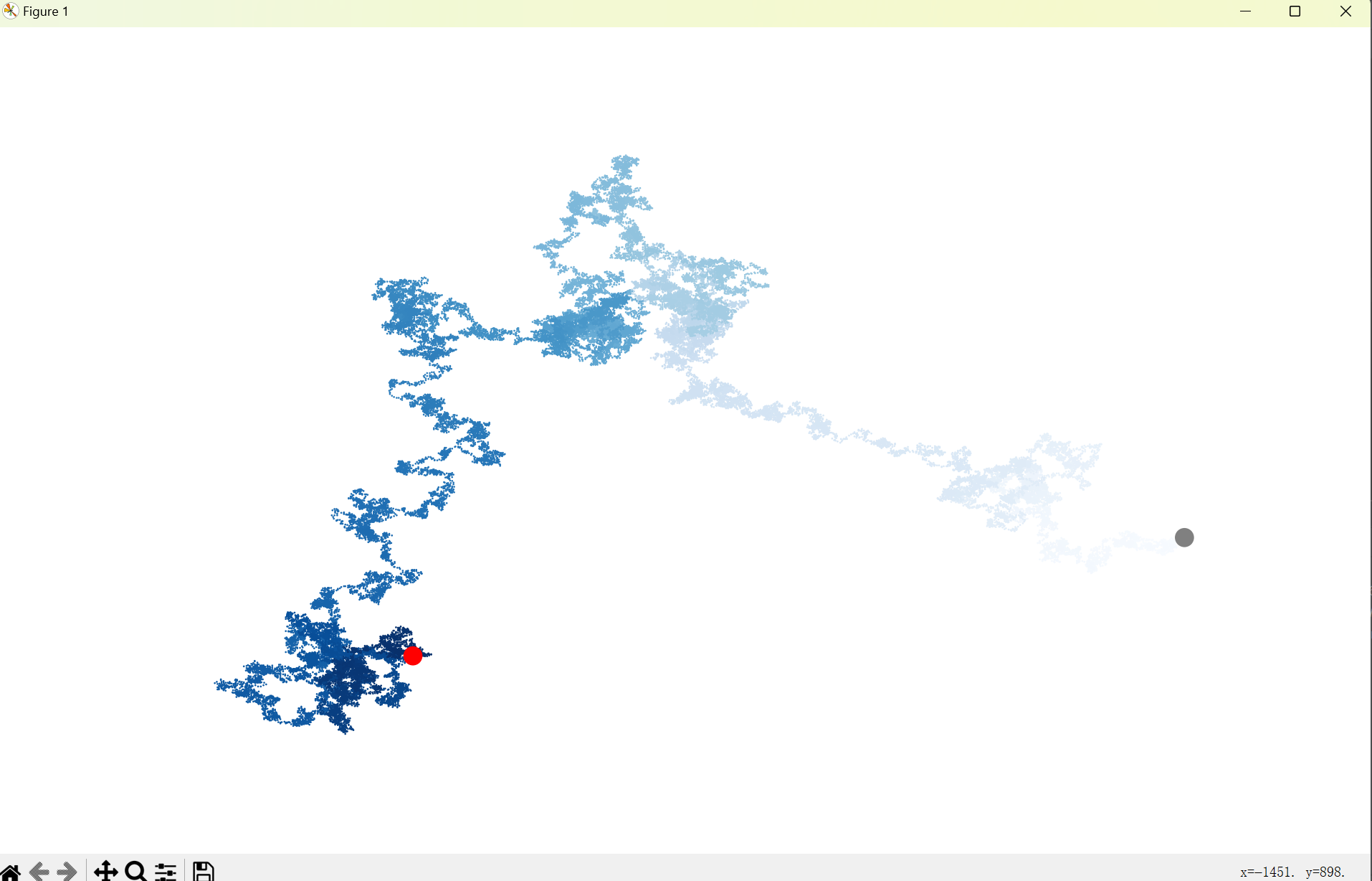 1 from matplotlib import pyplot as plt 2 from random_walk import RandomWalk 3 from time import sleep 4 # 代码范例中,模拟两次随机漫步过程 5 n = 0 6 while n < 2: 7 n += 1 8 # 创建一个RandomWalk对象,调用其方法生成随机游走坐标 9 rw = RandomWalk(50000) 10 rw.fill_walk() 11 # 用散点图进行可视化绘制 12 plt.figure(figsize = (10, 6), dpi = 128) 13 point_numbers = list(range(rw.num_points)) 14 plt.scatter(rw.x_values, rw.y_values, c=point_numbers, 15 cmap=plt.cm.Blues, edgecolor='none', s=1) 16 # 终点和起点 17 plt.scatter(0, 0, c = 'grey', edgecolors='none', s=100) 18 plt.scatter(rw.x_values[-1], rw.y_values[-1], c = 'red', 19 edgecolors='none', s=100) 20 # 隐藏坐标轴 21 plt.axis('off') 22 plt.show()