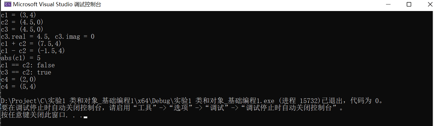 #include <iostream> #include <complex> // 测试标准库提供的复数类模板complex void test_std_complex() { using namespace std; complex<double> c1{ 3, 4 }, c2{ 4.5 }; const complex<double> c3{ c2 }; cout << "c1 = " << c1 << endl; cout << "c2 = " << c2 << endl; cout << "c3 = " << c3 << endl; cout << "c3.real = " << c3.real() << ", " << "c3.imag = " << c3.imag() << endl; cout << "c1 + c2 = " << c1 + c2 << endl; cout << "c1 - c2 = " << c1 - c2 << endl; cout << "abs(c1) = " << abs(c1) << endl; // abs()是标准库数学函数,对复数取模 cout << boolalpha; // 设置bool型值以true/false方式输出 cout << "c1 == c2: " << (c1 == c2) << endl; cout << "c3 == c2: " << (c3 == c2) << endl; complex<double> c4 = 2; cout << "c4 = " << c4 << endl; c4 += c1; cout << "c4 = " << c4 << endl; } int main() { test_std_complex(); }