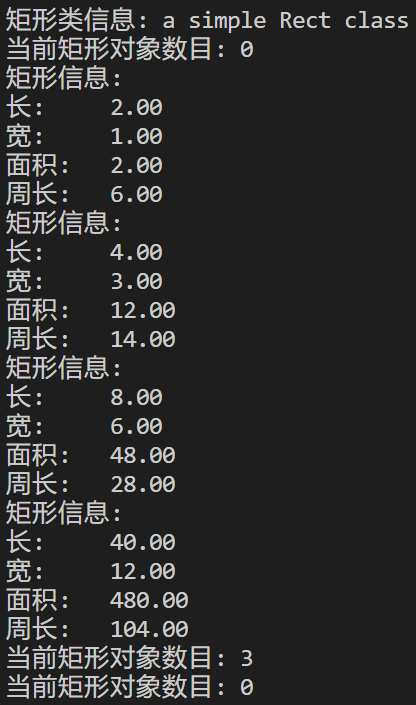 #include <iostream> #include <string> #include <iomanip> using namespace std; // 矩形类Rect的定义 class Rect { public: // 类属性 static const char* doc; // 对象属性 double length; double width; // 构造函数 Rect(double l = 2.0, double w = 1.0) : length(l), width(w) { size++; } // 复制构造函数 Rect(const Rect& other) : length(other.length), width(other.width) { size++; } // 析构函数 ~Rect() { size--; } // 普通函数成员 double len() { return length; } double wide() { return width; } double area() { return length * width; } double circumference() { return 2 * (length + width); } void resize(double times) { length *= times; width *= times; } void resize(double l_times, double w_times) { length *= l_times; width *= w_times; } // 静态成员函数 static int size_info() { return size; } private: // 类方法 static int size; // 友元函数 friend void output(const Rect& rect); }; const char* Rect::doc = "Rect class to represent rectangles."; int Rect::size = 0; void output(const Rect& r) { cout << "矩形信息: " << endl; cout << fixed << setprecision(2); // 控制输出格式:以浮点数形式输出,小数部分保留两位 } // 补足代码:分行输出矩形长、宽、面积、周长 void output(const Rect & rect) { std::cout << "矩形信息:" << std::endl; std::cout << "长度: " << rect.length << std::endl; std::cout << "宽度: " << rect.width << std::endl; std::cout << "面积: " << rect.area() << std::endl; std::cout << "周长: " << rect.circumference() << std::endl; } // 测试代码 void test() { cout << "矩形类信息: " << Rect::doc << endl; cout << "当前矩形对象数目: " << Rect::size_info() << endl; Rect r1; output(r1); Rect r2(4, 3); output(r2); Rect r3(r2); r3.resize(2); output(r3); r3.resize(5, 2); output(r3); cout << "当前矩形对象数目: " << Rect::size_info() << endl; } // 主函数 int main() { test(); cout << "当前矩形对象数目: " << Rect::size_info() << endl; }