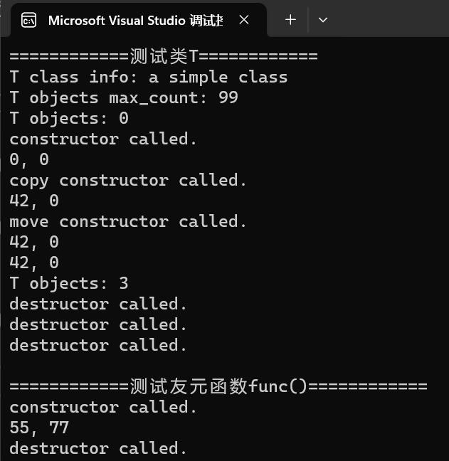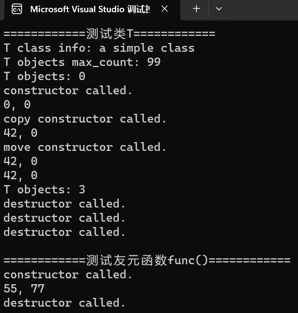 #include "t.h" // 测试 void test() { cout << "T class info: " << T::doc << endl; cout << "T objects max_count: " << T::max_count << endl; T::disply_count(); T t1; t1.display(); t1.set_m1(42); T t2{ t1 }; t2.display(); T t3{ std::move(t1) }; t3.display(); t1.display(); T::disply_count(); } // 主函数 int main() { cout << "============测试类T============" << endl; test(); cout << endl; cout << "============测试友元函数func()============" << endl; func(); }