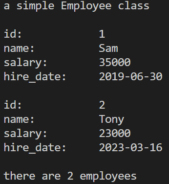 #include "Employee.hpp" #include <iostream> // 测试:Employee类 void test() { using std::cout; using std::endl; cout << Employee::doc << endl << endl; Employee employee1; employee1.set_info("Sam", 30000, 2015, 1, 6); employee1.update_hire_date(2019, 6, 30); employee1.update_salary(35000); employee1.display_info(); cout << endl << endl; Employee employee2{"Tony", 20000, 2023, 3, 16}; employee2.raise_salary(15); // 提成15% employee2.display_info(); cout << endl << endl; Employee::display_count(); } int main() { test(); }