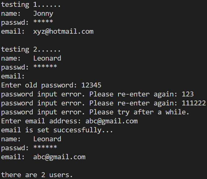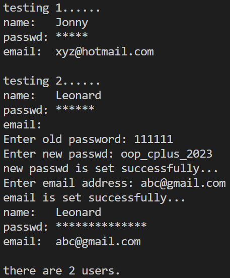 #pragma once #include<string> #include<iostream> using namespace std; class User { public : User (string x = "Mary", string p = "111111", string e = "") { string name = x; string password = p; string email = e; n++; }; ~User() { n--; } private : string name; //类的数据成员,name,password,email string password; string email; static int n; //描述类的对象个数,即用户总数 //成员函数 public : void set_email(); //邮箱 void change_password(); //改密码 void print_info (); //打印用户名,密码,邮箱 static void print_n(); }; //实现类 int User:: n = 0; void User:: set_email(){ cout << "Enter email address: abc@gmail.com" << endl; cin >> email; cout << "email is set successfully..." << endl; } void User::change_password() { cout << "Enter old password :" << endl; string password1; cin >> password1; for (int i = 0; i < 3; i++) { if (password != password1) //判断密码是否相同 cout << "password input error.Please re_enter again:" << password1 << endl; else { cout << "enter new password :" << endl; string password2; cin >> password2; //新密码 password = password; } } cout << "password input error.Please try after again a while" << endl; } void User::print_info() { string p(password.size(), '*'); cout << "name: " << name << endl; cout << "passwd: " << password << endl; cout << "email: " << email << endl; } void User::print_n() { cout << "there are " << n << " users." << endl; }