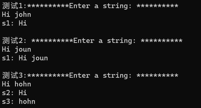 #include <iostream> #include <string> #include <limits> using namespace std; int main() { const int n = 10; string prompt = string(n, '*') + "Enter a string: " + string(n, '*') + '\n'; cout << "测试1:"; cout << prompt; string s1; cin >> s1; //从输入流中提取字符串给s1,碰到空格、回车、Tab键即结束 cout << "s1: " << s1 << endl; cin.ignore(numeric_limits<streamsize>::max(), '\n'); //清空缓冲区 cout << "\n测试2: "; cout << prompt; getline(cin, s1); //从输入流中提取字符串给s1,直到换行 cout << "s1: " << s1 << endl; cout << "\n测试3:"; string s2, s3; cout << prompt; getline(cin, s2, ' '); //从输入流中提取字符串给s2,直到换行 getline(cin, s3); cout << "s2: " << s2 << endl; cout << "s3: " << s3 << endl; }
